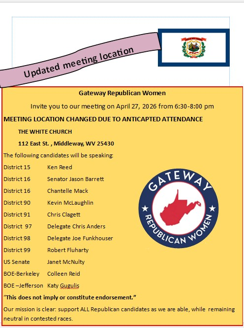 Gateway Republican is an affiliate of the West Virginia Federation of Republican Women (WVFRW) and the National Federation of Republican Women (NFRW) and became affiliated in 2005. Gateway covers Jefferson, Berkeley and Morgan counties that make up the Eastern Panhandle of West Virginia.